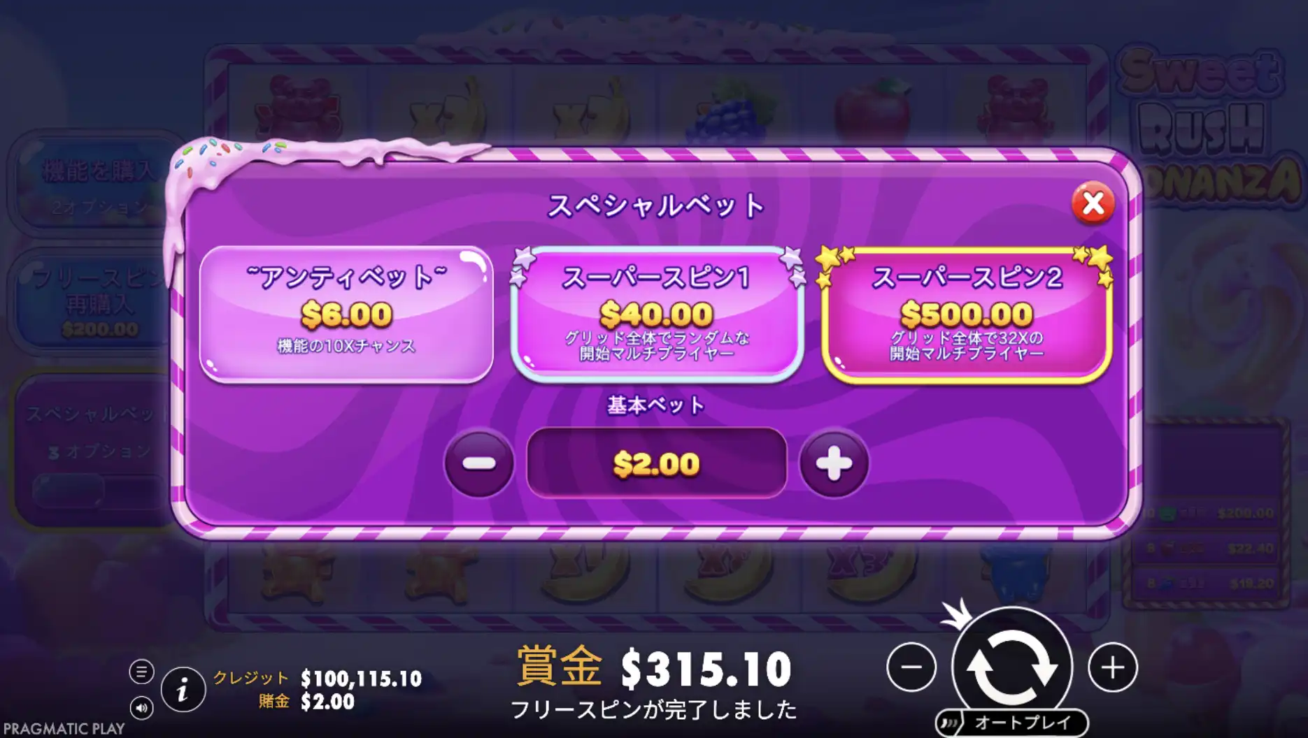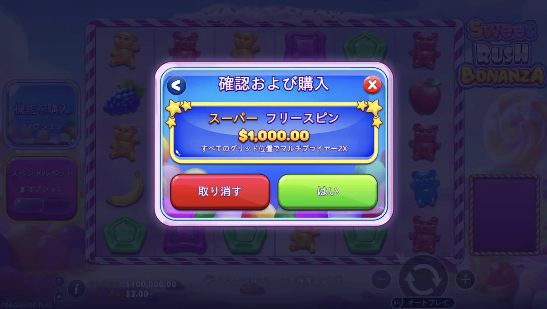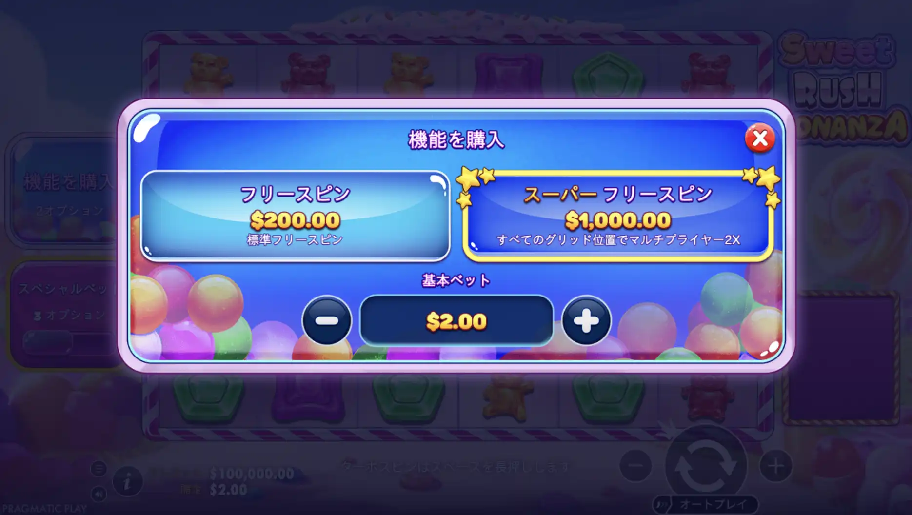 スイートラッシュボナンザにはスペシャルベット機能という以下の3つのオプションがあります。どれも基本的には1スピンのリスクをあげ、高配当を狙うものですが、低リスクのものから超高リスクのものまであります。