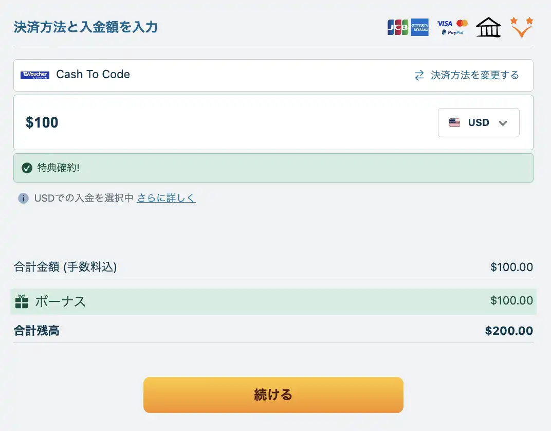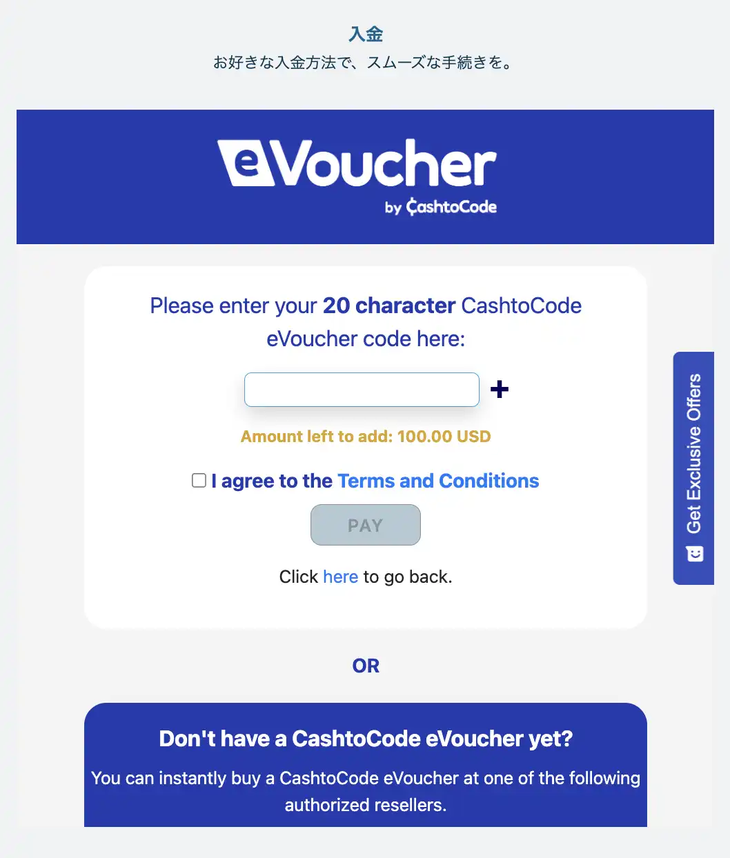 ※eVoucher by Cash To Code とは特定の販売サイトで前もって入金のためのバウチャーを購入するプリペイド式の決済方法です。このeバウチャーのコードを入力することで入金することができます。