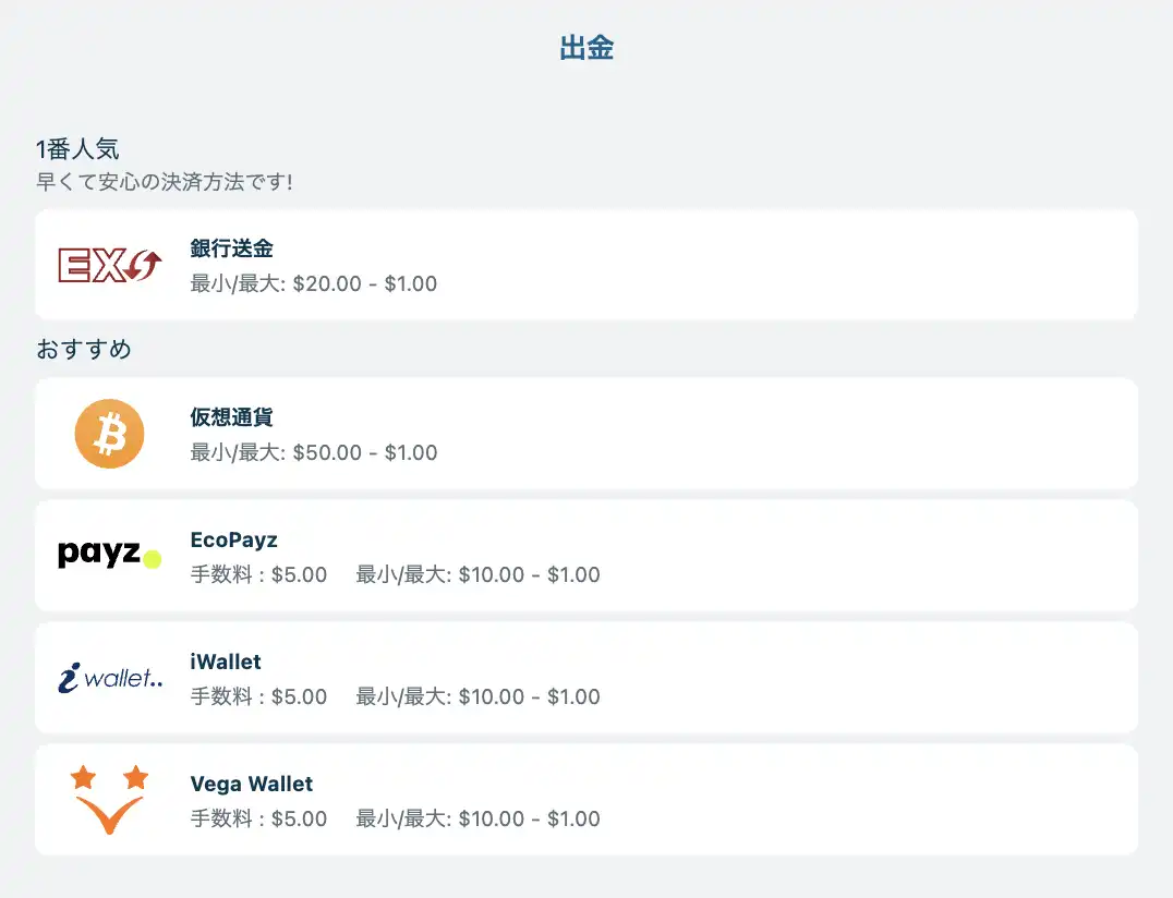 「出金」をクリックすると利用できる出金方法が表示されるので、希望の出金方法を選びます。